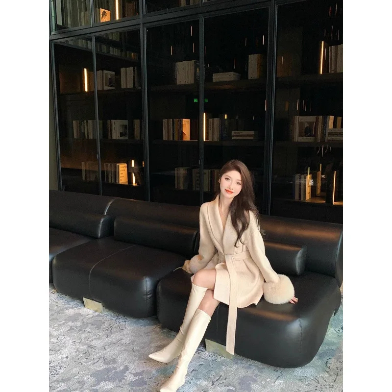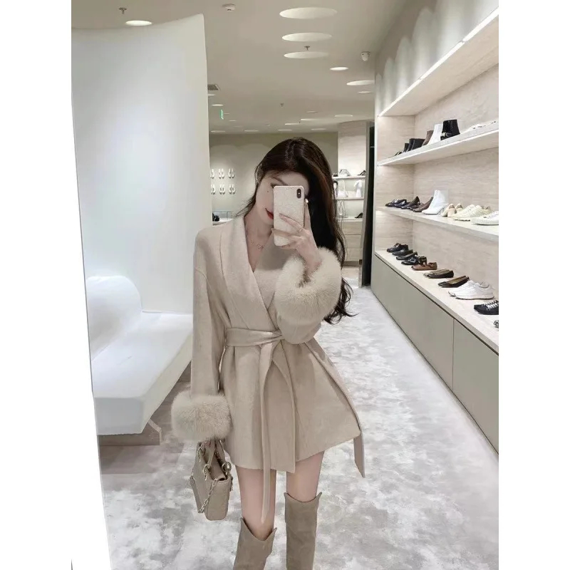 معطف نسائي أنيق من الصوف للخريف والشتاء، طويل الأكمام وذو خصر مقصوص يبرز القامة. تصميمه مربوط ويحتوي على تفاصيل فروية، يعطي لمسة راقية وعصرية. مثالي للبس اليومي أو المناسبات الباردة، دافئ ومريح.