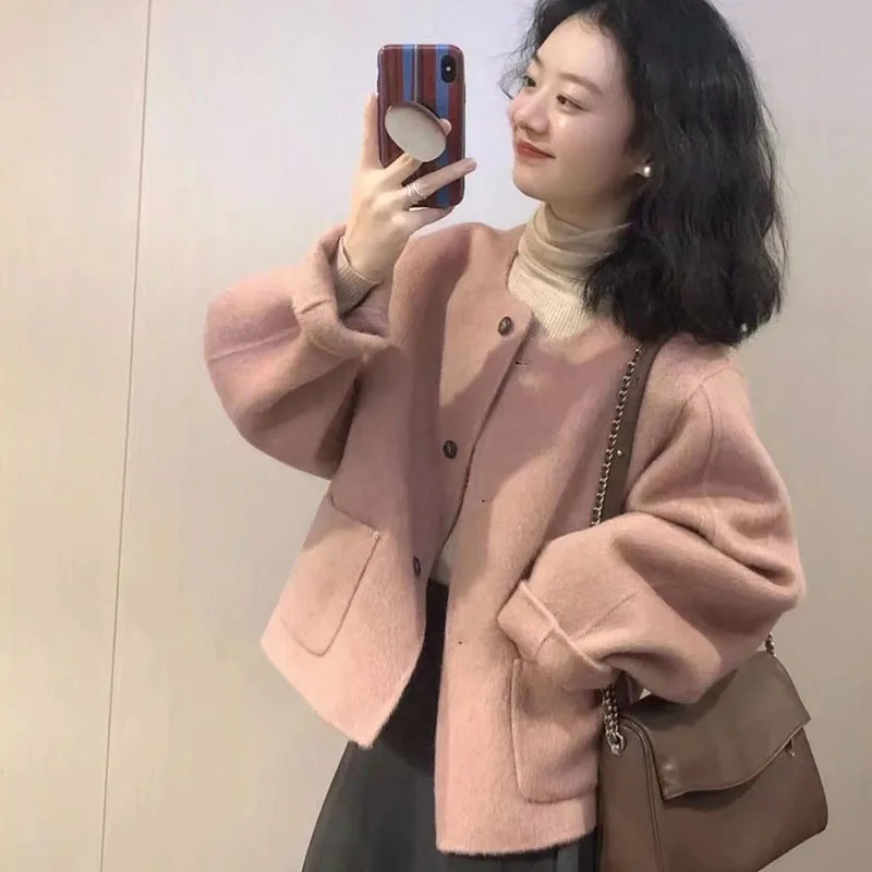 معطف صوفي نسائي من Lucyever بخريف وشتاء 2024، تصميم كوري أنيق بطبقة صوفية دافئة وياقة مستديرة. قصّة قصيرة وصدر واحد تعطي إطلالة مرتبة وعصرية، مثالي للبس اليومي والطلعات في الجو البارد.